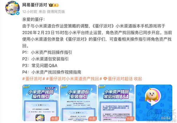 五年后,丁磊决定不忍了。日前,网易旗下表象级游戏《蛋仔派对》在官网及酬酢平台发布公告称,因小米渠谈协作运营战术调度,将于2026年2月23日15时住手游戏在小米平台的运营,2025年12月22日10时起关闭下载、充值及新注册,小米包体玩家可稽查关联操作指挥将脚色金钱找回。