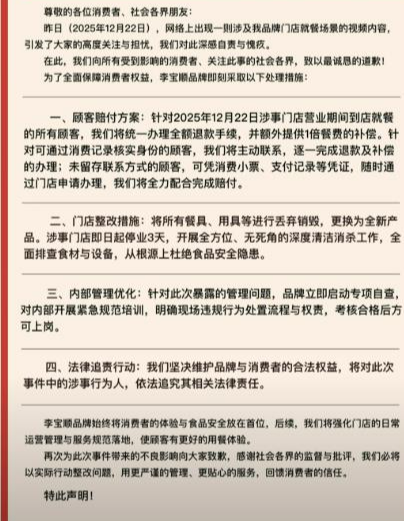 23日,涉事门店在网上发布了对此事的讲解,默示此事激发了全国的高度温雅与担忧,该店对此深感自责与傀怍。在主顾赔付决议中,该店默示将结伴办理全额退款手续,并罕见提供1倍餐费的抵偿。此外,讲解还提到了门店整改步调,品牌立即运转专项自查,将对这次事件中的涉事当作东谈主照章根究其关连法律包袱等。